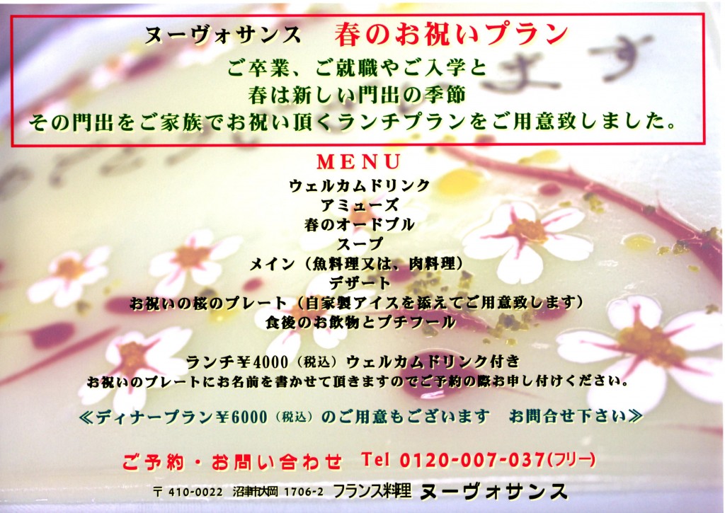 その門出をご家族でお祝い頂くランチプランをご用意致しました