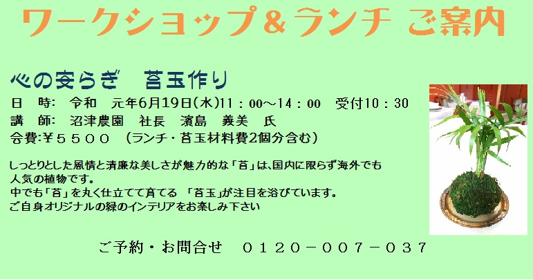 6/19(水)ワークショップ&ランチ 開催 イベント 2019.06.042024.05.22 心の安らぎ 苔玉作り 日 時: 令和 元年6月19日(水)11:00〜14:00 受付10:30 講 師: 沼津農園 社長 濱島 義美 氏 会費:¥5500 (ランチ ・ 苔玉材料費2個分含む)当日現金にてお支払いいただきます しっとりとした風情と清廉な美しさが魅力的な 「苔」 は、国内に限らず海外でも人気の植物です。 中でも 「苔」 を丸く仕立てて育てる 「苔玉」が注目を浴びています。 ご自身オリジナルの緑のインテリアをお楽しみ下さい ご予約・お問合せ 0120−007−037