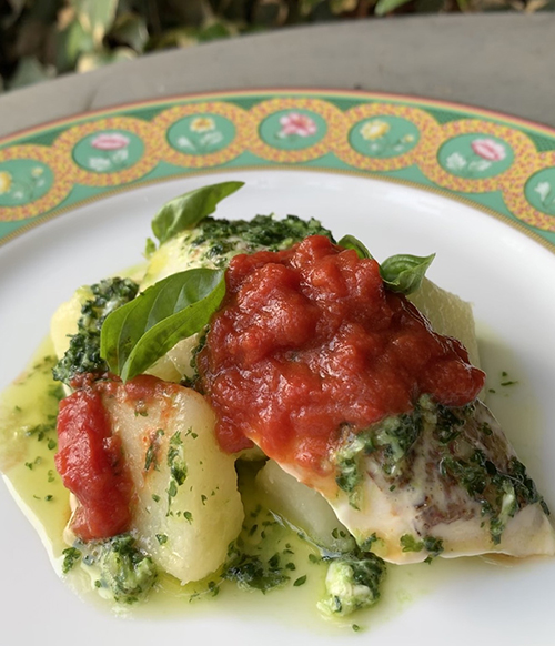 ◇沼津港より真鯛のトマトと香草風味わたなべ農園のレットムーンと共に