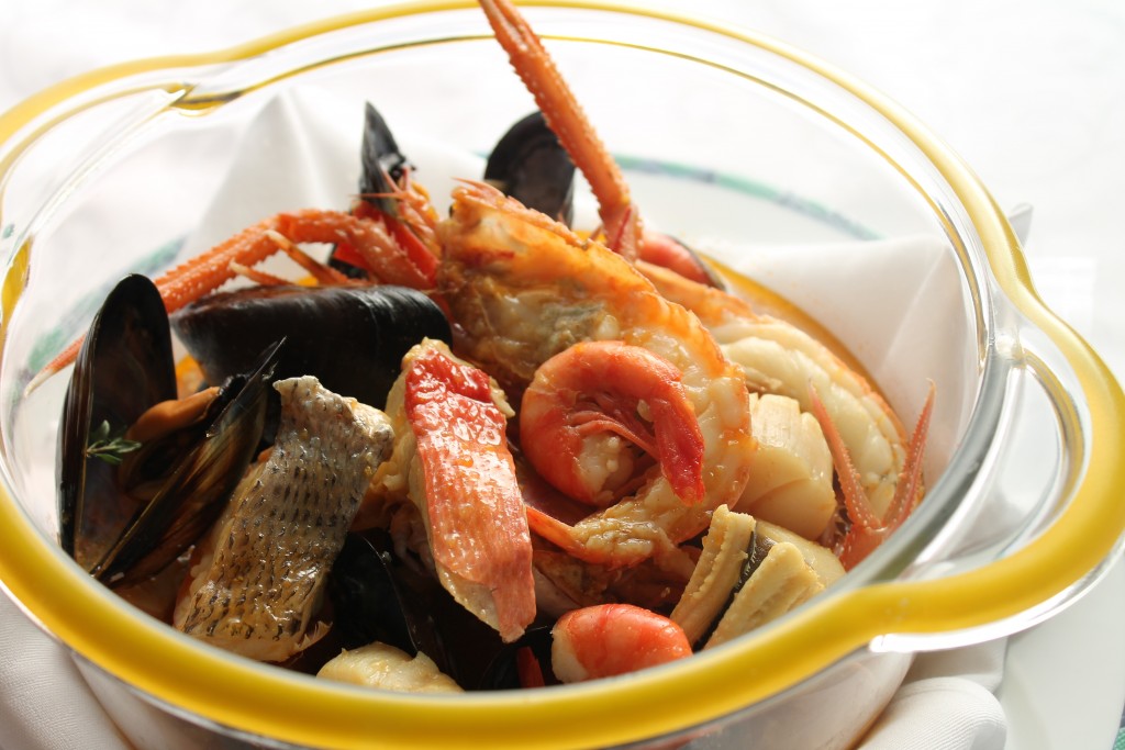 シェフが沼津港の魚市場で自分の目利きで選んだ海の幸をルイユ・ソースとクルトンを浮かべアツアツでお楽しみください