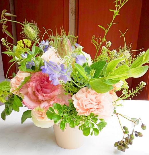 ミドリヤ・フローリスト岩崎有加さんのアレンジメントフラワーをセットでご用意しました。