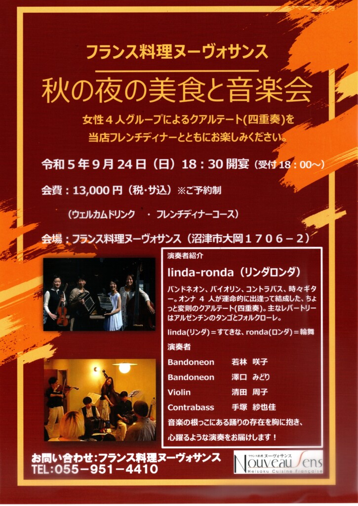 秋の夜の美食と音楽会 9/24(日)開催 What's New 2023.09.052024.05.22 女性4名の宇アルテート「linda-ronda リンダロンダ」、 ウーヴォサンスのディナーとディナーとともにお楽しみください バンドネオン・ヴァイオリン・コントラバスのアンサンブル ご予約・お問合せ 055-951-4410